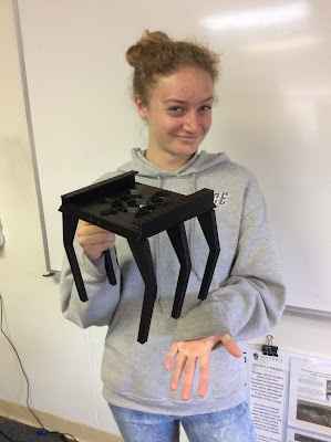 Firstly, Jenna was tasked with designing a custom-made stand for Mr. Meadth’s secondary computer monitor. She measured the necessary dimensions, and came up with an idea to make anyone happy: a giant mechanical bug… with a smiley face!