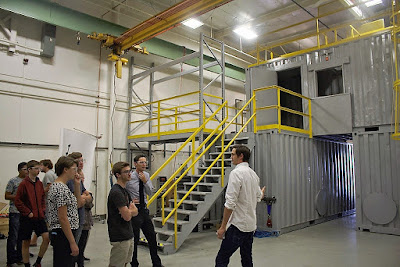 From there, the class took a walk through the rest of the testing and manufacturing facility. CMC has constructed an impressive indoor “playground”, welded together out of shipping containers, that allows them to simulate rescue scenarios (escaping out of a burning building, for example). The students peeked inside to see the network of tunnels and a fake grain hopper. Unfortunately, no volunteer equipment testing was enacted!