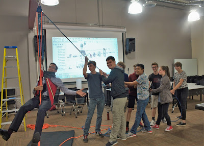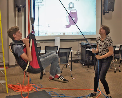 After passing through the in-house sewing manufacturing zone, the students arrived back in the conference room, and were given the chance to put a new pulley design to the test. A broad steel beam ran the width of the conference room, and Aaron (10th Grade) and Eva (9th Grade) were placed into a typical safety harness, and then hoisted up by their classmates. The mechanical advantage of a compound pulley system was made apparent, multiplying force dramatically.