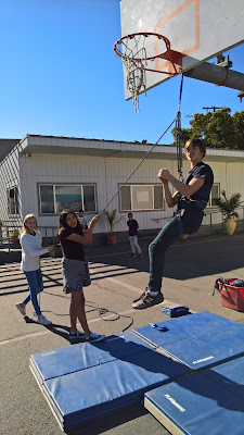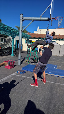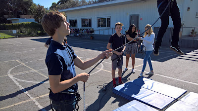 Using Mr. Gill’s outdoor education equipment and some 400 lb pulleys from Ace Hardware, the students themselves arranged the constituent pieces, hanging from the sturdy structure of the outdoor basketball hoop (not the hoop itself). On the previous day, they had worked with small model version indoors, so they knew how to set things up. It didn’t hurt to have some Boy Scouts in the group, too!