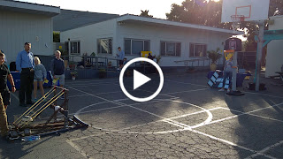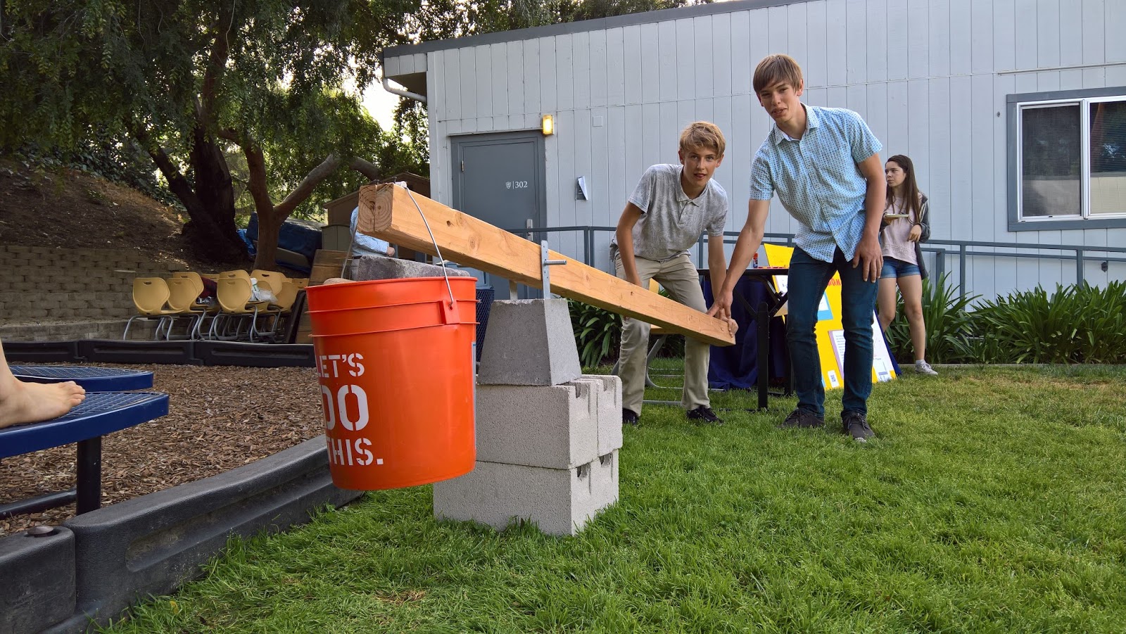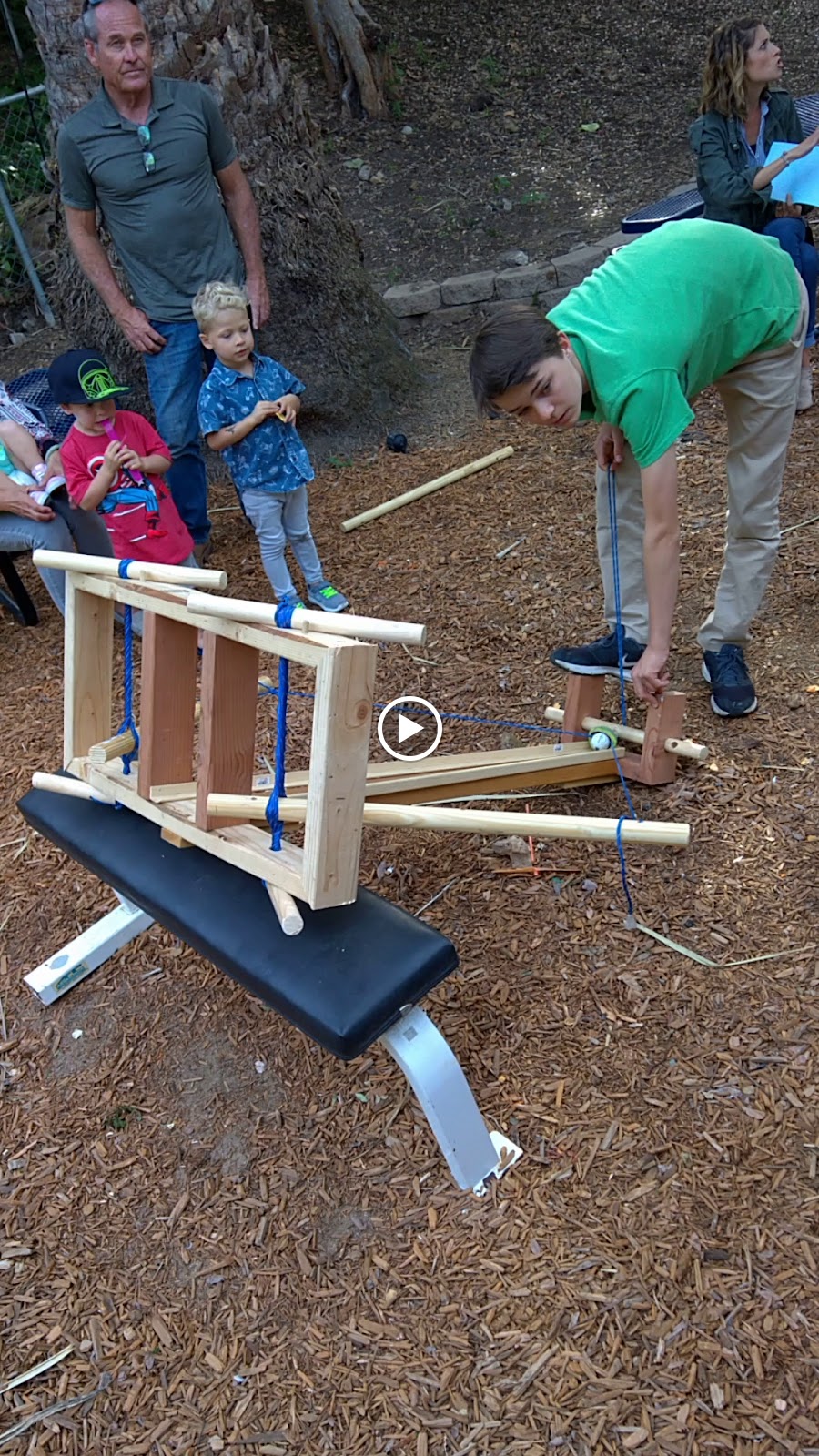 Julian and Zak loading a high-tension catapult, constructed entirely