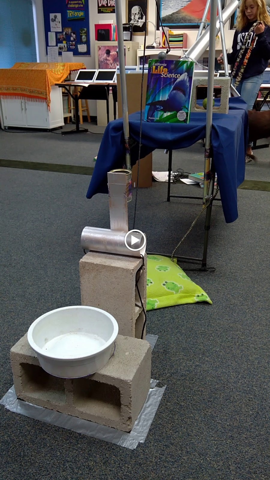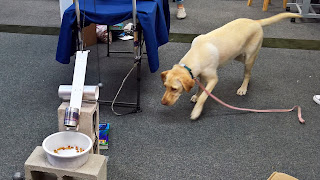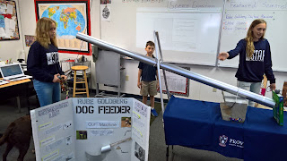 | Tessa and Chloe show their Rube Goldberg dog feeding machine |