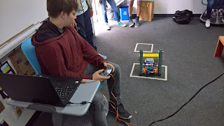 Next up was “Daddy Long Legs,” a robot with motorized wheels attached to extended legs. It was built by Caleb, Sydney, and Zach. Caleb, the driver, slowly completed the run, also skipping the very difficult 45° incline. On the camera-only trial, the robot was not able to place the payload in the designated area.
