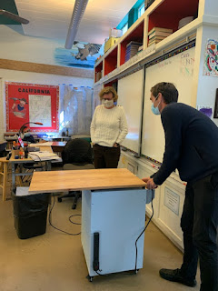 In March 2021, after six months of work, it was finally time to deliver the finished product. With the help of Mr. Knoles, the Lower School Principal, Mr. Meadth surprised the entire class one morning with the desk delivery. Mrs. Jones was delighted to receive the desk, and promptly filled it with her hefty teacher editions—which definitely helped as a counterbalance to the cantilever design!